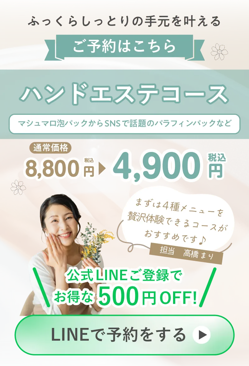 乾燥・くすみ・冷え・血行不良など、大人女性の手元悩みを徹底ケア。泡パック・美容導入トリートメント・パラフィンパック・リンパハンドマッサージなど、ハンドエステをご用意しております。