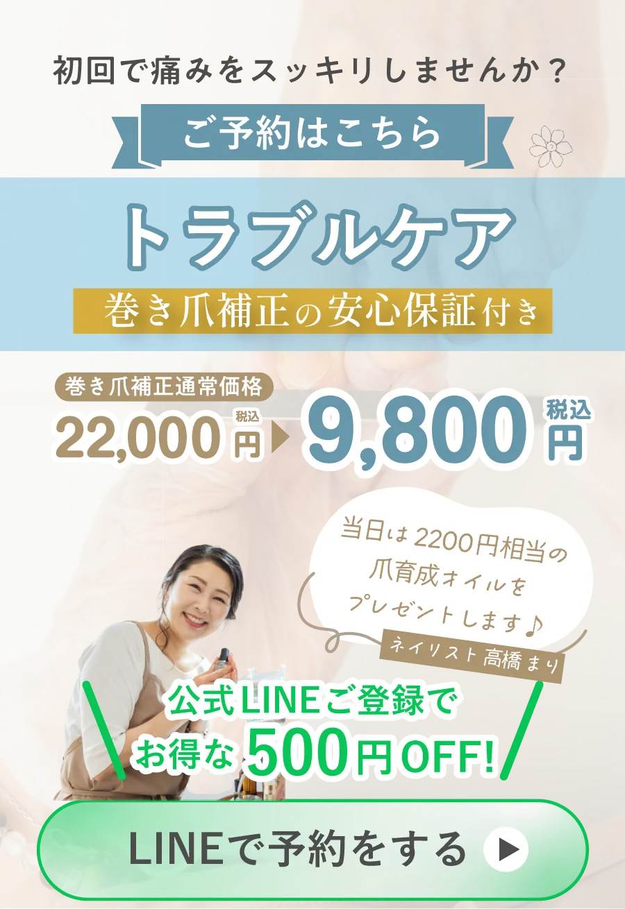 当サロンでは歴20年のネイリストが初回の時点で爪周囲を丁寧かつ適切にケアを行うため、爪は広がり痛みもなくなります。多くの方が初回の施術でつまりがなくなり痛みがなくなったなどの、痛みの変化を実感されています。健康的な足を目指すハードルの低いお手軽ケアを安心して受けていただけます。
